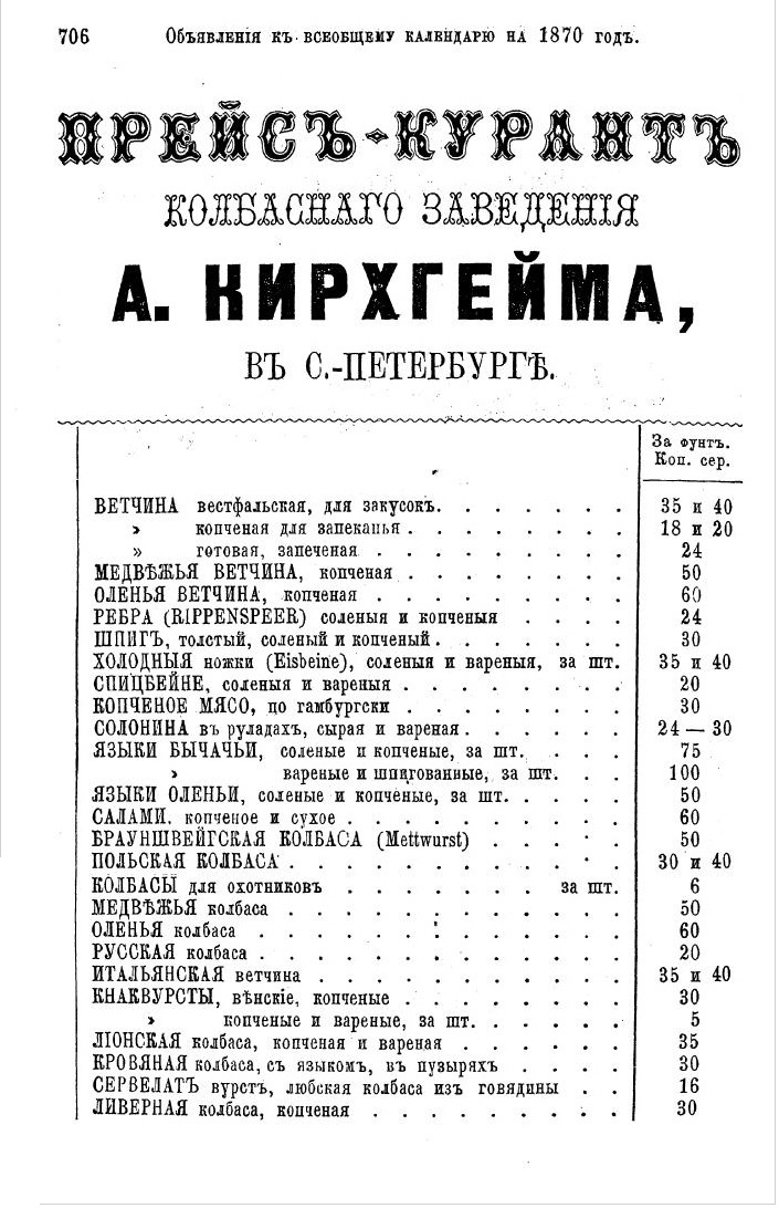 «Самая дешевая колбаса была ливерная — вареная, для простонародья. Она продавалась по 10 копеек за фунт. Затем шла так называемая чайная (тоже вареная) по 20 копеек за фунт. Самая дорогая колбаса любекская (натуральная копченая свинина) — 60 копеек за фунт, салями — тоже 60 копеек».