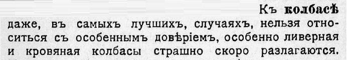 Да, скажу я вам. Такую ливерную и я бы попробовал. При всем при этом у ливерной колбасы был, конечно, один недостаток: срок хранения. «Ливерная из печенки и свинины, — отмечали столичные врачи в изданном в 1897 году сборнике „Город Санкт-Петербург с точки зрения медицинской полиции“, — портится скоро, но на леднике может продержаться около 6 дней». Да и пособия по хозяйству замечали эту особенность колбасы: