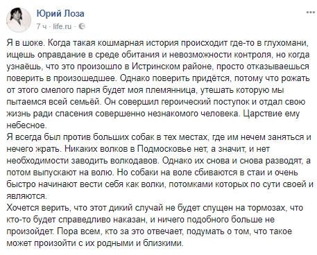 «Он совершил героический поступок и отдал свою жизнь ради спасения совершенно незнакомого человека. Царствие ему небесное», — написал Лоза.