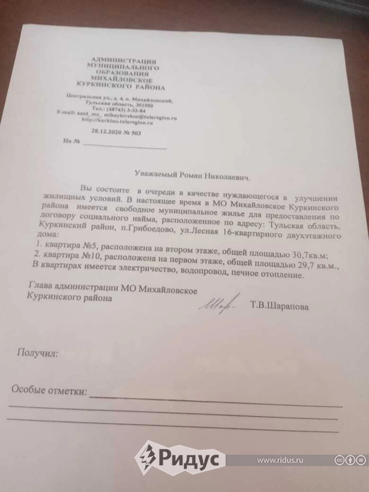 Другого благоустроенного жилья у нас нет. Мы обязаны по закону предложить ему вот это освободившееся жилье, что мы и сделали. Строительство же не ведется, поэтому можем предложить только то, что высвобождается, а это сами понимаете как происходит: кто-то умирает, и после этого передается. Очередь не движется, потому что нет домов, — прокомментировала ситуацию ridus.ru глава администрации муниципального образования Михайловское Куркинского района Татьяна Шарапова.