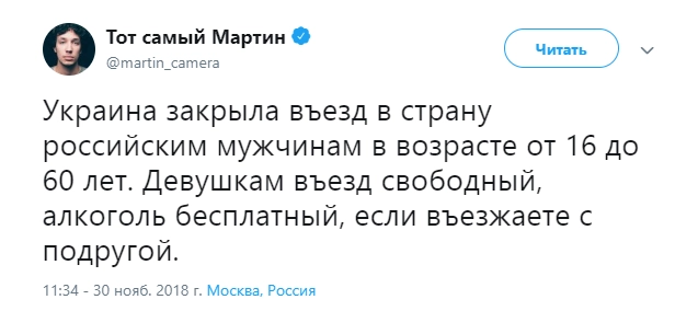 Теперь российским мужчинам от 16 до 60 лет запрещен въезд на Украину. Но они не унывают и шутят по этому поводу в Сети.