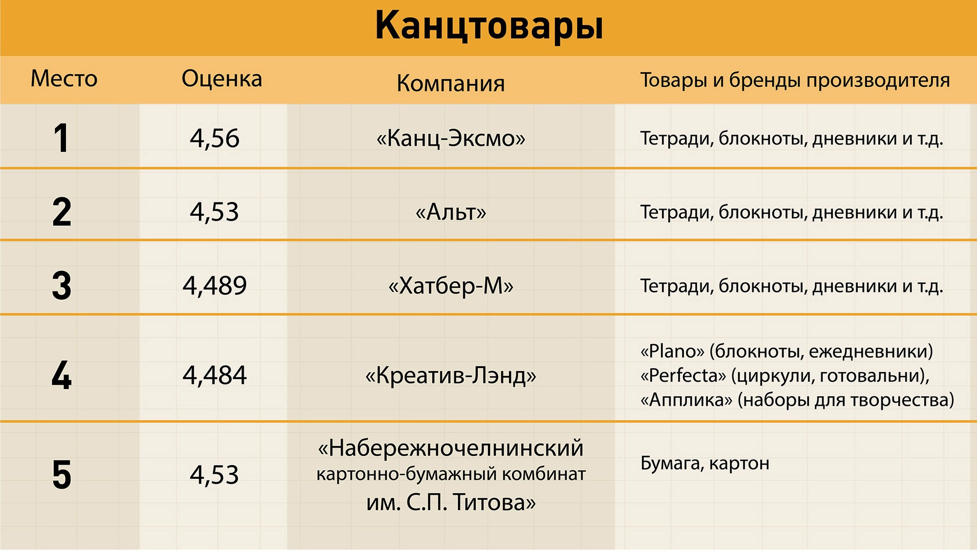 Первое место в рейтинге производителей канцтоваров заняла компания «Канц-Эксмо», а верхняя пятерка в этой категории выглядит следующим образом: