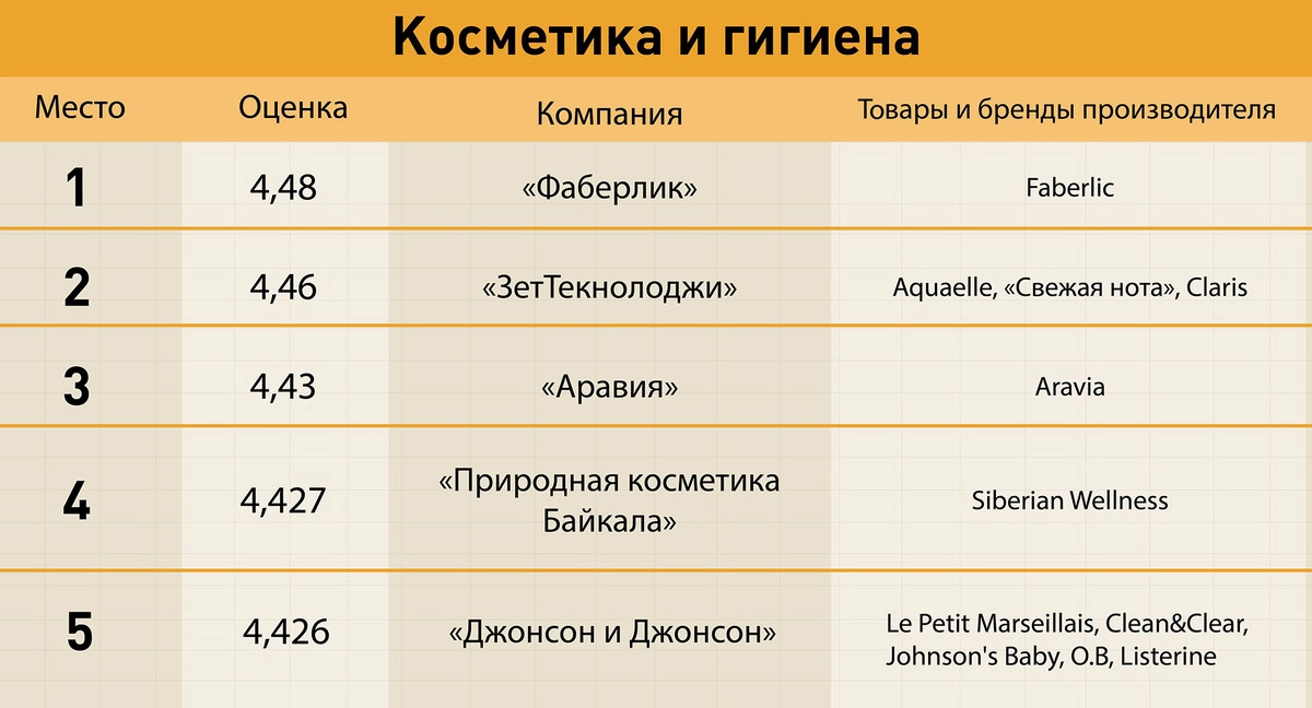 Рейтинг производителей косметических и гигиенических товаров возглавляет компания «Фаберлик», а вот как выглядит топ-5 в этой категории: