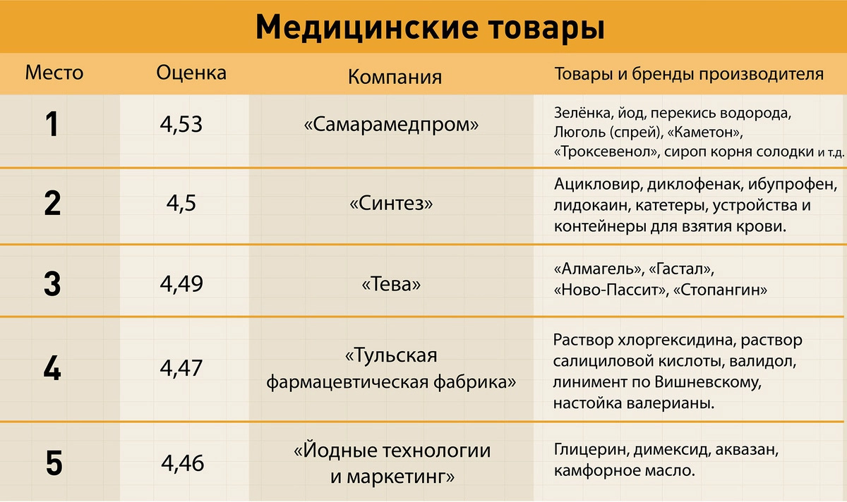 150 производителей с наивысшими средними оценками были разделены на четыре категории: канцтовары, косметика и гигиена, медицинские товары и продукты питания.
