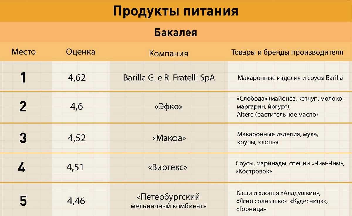 Лучшим производителем бакалейных товаров оказался итальянский производитель макаронных изделий Barilla, молочной продукции — «Талицкие молочные фермы», сладостей — «Nestle Россия», хлеба и выпечки — «Хлебпром», безалкогольных напитков — завод минеральных вод «Рычал-Су» и алкогольной продукции — «Башспирт». Подробнее: