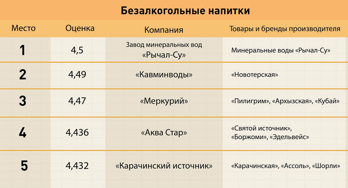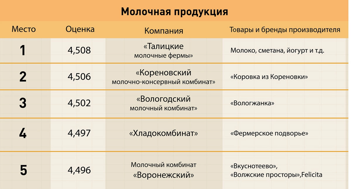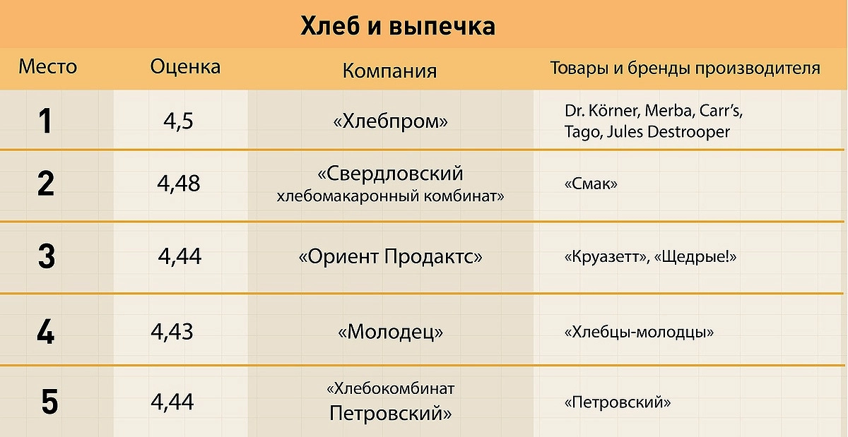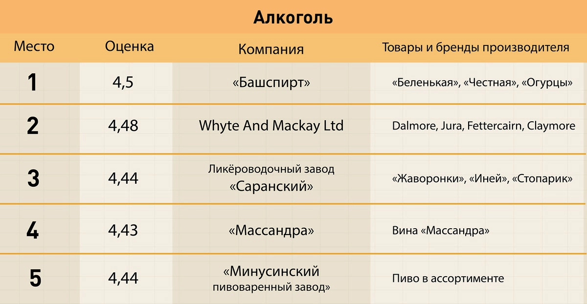 Самая многочисленная категория — продукты питания — была поделена на шесть подкатегорий: молочная продукция (лидер — «Талицкие молочные фермы»), бакалея (Barilla), хлеб и выпечка («Хлебпром»), сладкое («Nestle Россия»), безалкогольные напитки (завод минеральных вод «Рычал-Су»), алкоголь («Башспирт»).