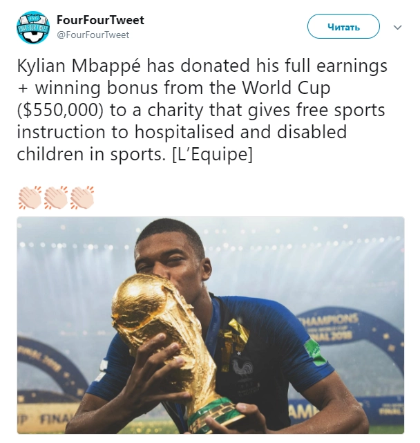 Нападающий сборной Франции Килиан Мбаппе, признанный на чемпионате мира по футболу — 2018 лучшим молодым игроком, отказался от денег, заработанных за участие в турнире, и передал их на благотворительность.