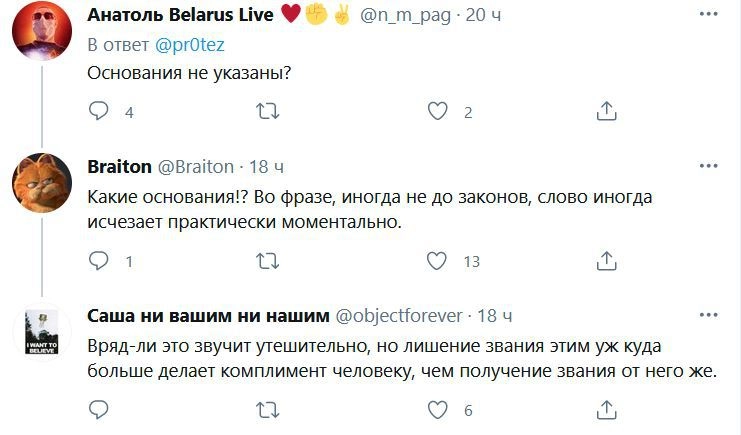 Подписчики Протасевича-младшего отмечают, что лишение звания делает комплимент бывшему военному или силовику в Белоруссии, и предполагают, что, возможно, отцу основателя канала NEXTA все же стоило принимать участие в протестных акциях.