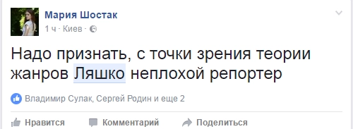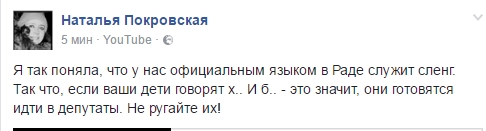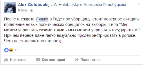 «Заходит уборщица в туалет Верховной рады, а там в унитазах нассано, насрано, бардак полный. Уборщица, которая до Нового года получала зарплату полторы тысячи гривен, а теперь три тысячи, в сердцах убирает и говорит: „*** твою мать, нехай, б***, они своим х*** управлять не умеют, а хотят руководить страной“. Вот я хочу, чтобы они и „х“ своим управляли, и державой, а если не умеют — сокращать к е***е матери и набирать новых», — рассказал Ляшко.