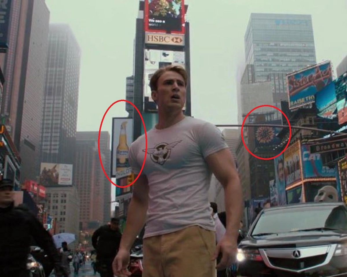 В концовке картины Стив Роджерс просыпается после 70-летнего пребывания во льдах и оказывается в современном Нью-Йорке. В какой-то момент он выбегает на площадь Таймс-сквер, где на щитах красуется огромное количество рекламы. Кадр именно с этим моментом опубликовал пользователь lexfuture в Instagram.