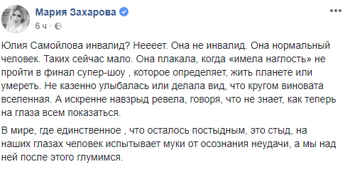 По мнению Захаровой, отдельного внимания заслуживают рассуждения критиков о том, что певица «давила на жалость», используя свою инвалидность,