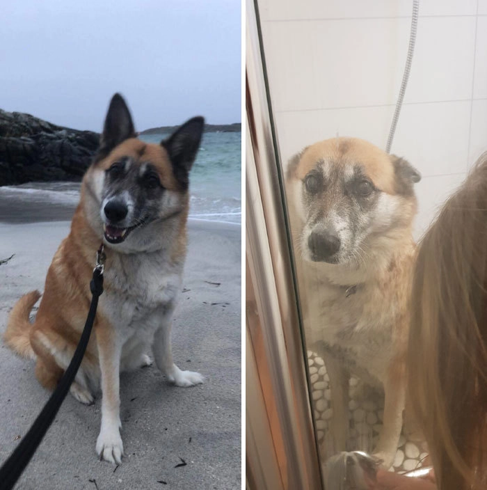 15. «Мой пёс на пляже и в душе после прогулки по песку»