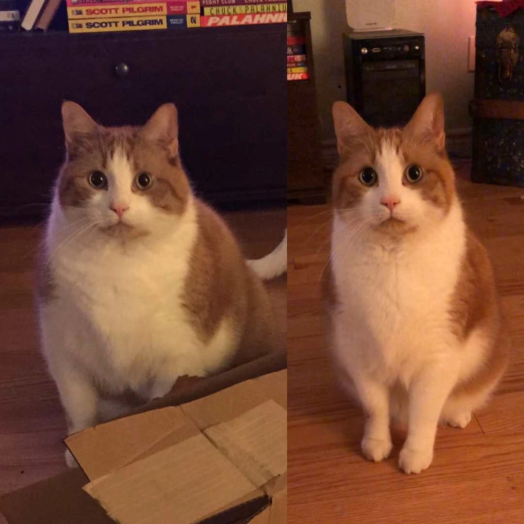 30. «Мой кот год сидел на диете, делал физические упражнения и похудел»
