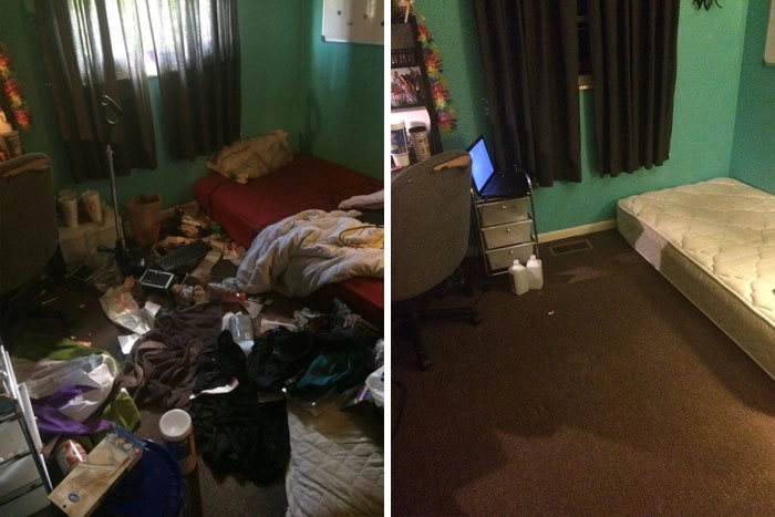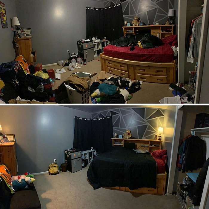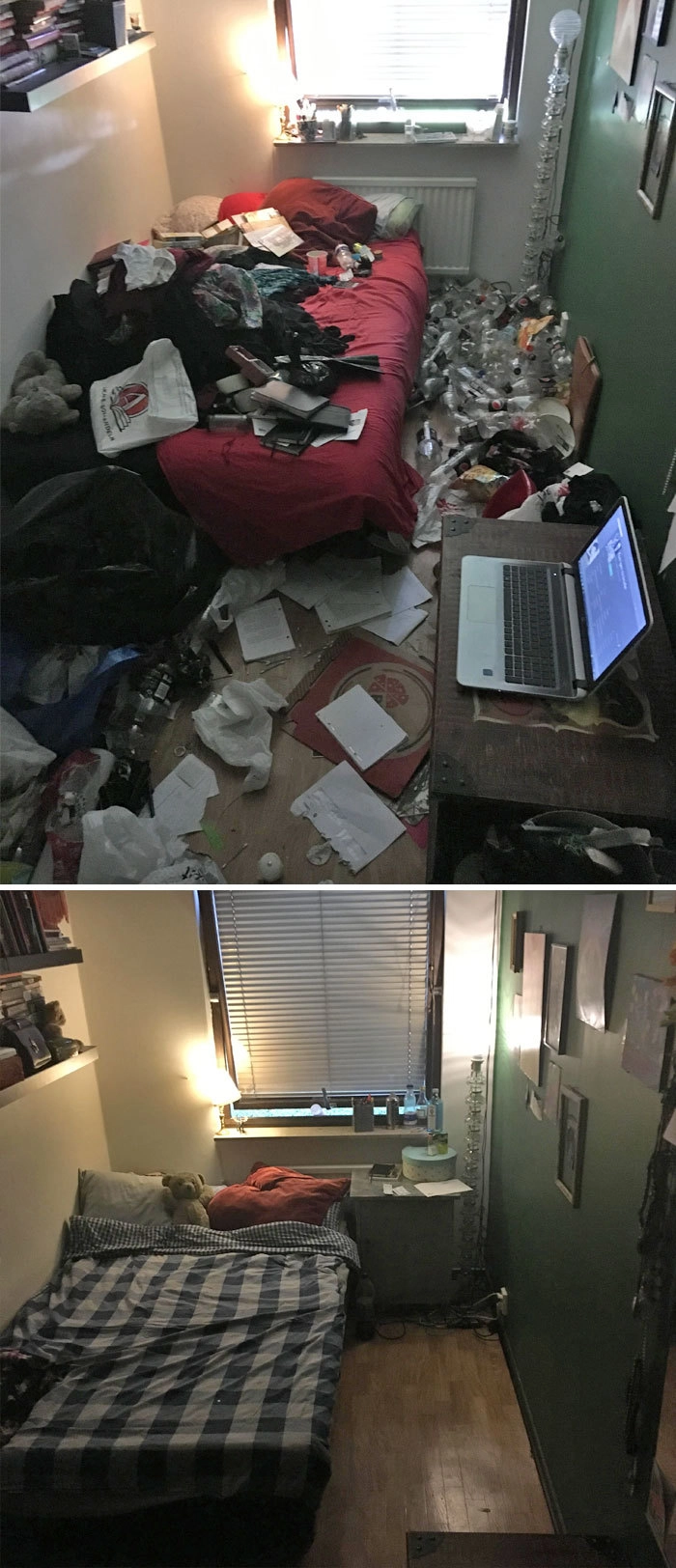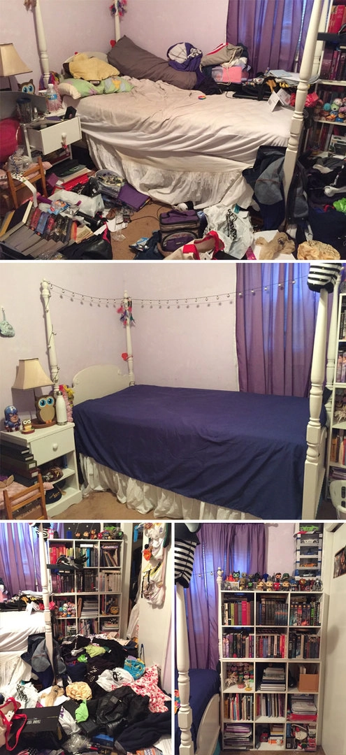 Мне был поставлен диагноз тяжёлой депрессии, когда мне было около 12. В этом году мне будет 19. У меня всегда были большие трудности с сохранением презентабельности моей комнаты, и, оглядываясь на эти фотографии, я искренне чувствую отвращение к тому, как я раньше жил. Две недели назад я решил, что больше не буду так жить. С тех пор я занимался уборкой, по крайней мере, по пять часов в день. И теперь я рад сказать, что моя комната почти готова. Я пожертвовал 80% своих вещей, включая одежду, старые книги, старые игрушкии т. д. На данный момент я всё ещё работаю. Моя комната совершенно пуста. Даже мебель исчезла. Мой план состоит в том, чтобы перекрасить и сделать футон вместо моего полуторагодовалого матраса. Когда я начал, это казалось невозможным. А теперь я горжусь работой, которую проделал, и я захотел поделиться этим, чтобы поддержать людей, которые переживают то же самое. Всё выполнимо!