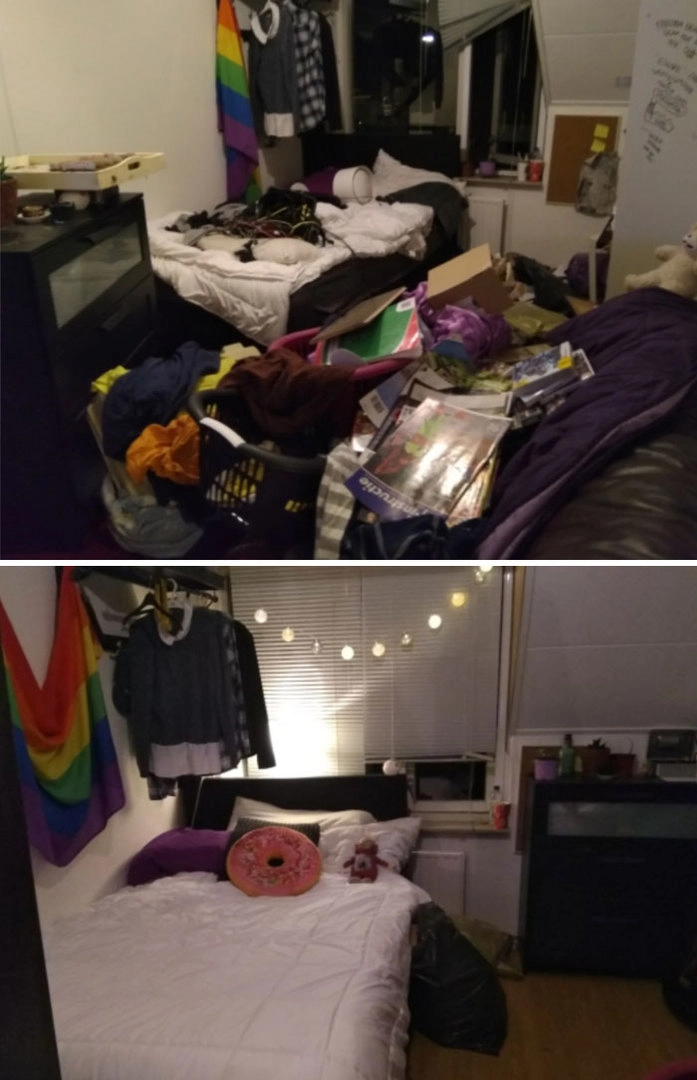 Моя комната никогда не была образцом чистоты, но состояние моей среды обитания только ухудшило мое психическое состояние. Три года я справляюсь со своей депрессией. Уборка — важный шаг. В кадр не попали огромные груды собранного белья, шесть полных мешков для мусора или четыре мешка вещей, которые пошли на пожертвования.