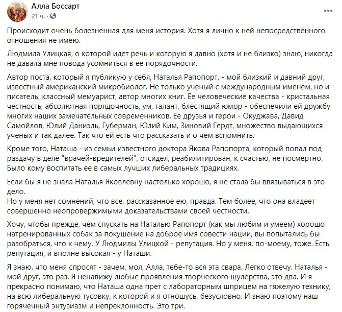 Если бы я не знала Наталья Яковлевну настолько хорошо, я не стала бы ввязываться в это дело. Но у меня нет сомнений, что все, рассказанное ею, правда. Тем более, что она владеет совершенно неопровержимыми доказательствами своей честности. Хочу, чтобы прежде, чем спускать на Наталью Рапопорт (как мы любим и умеем) хорошо натренированных собак за покушение на доброе имя совести нации, вы попытались бы разобраться, что к чему, — заявила Боссарт.