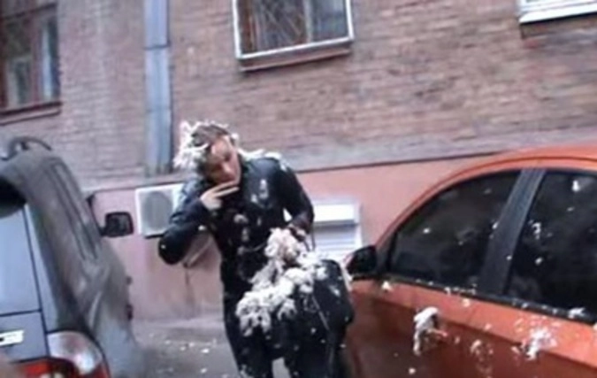 Люстраторы под «Слава Украине» облили женщину маслом и обсыпали перьями