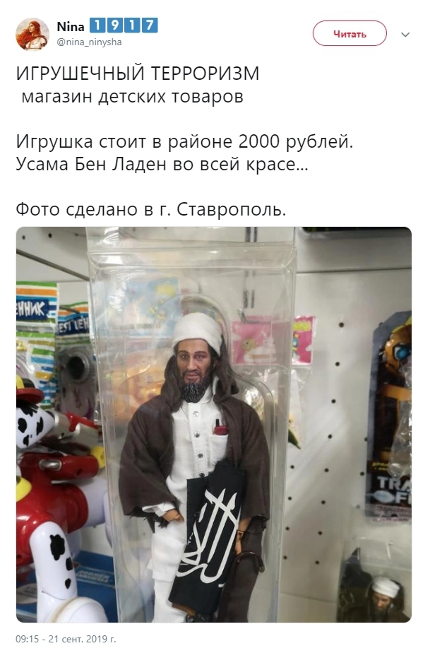Администрация магазина игрушек в Ставрополе распорядилась снять с продажи фигурки главаря террористической организации «Аль-Каида»* Усамы бен Ладена, сообщает «360».