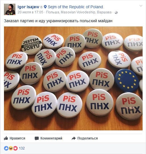 Стоит отметить, что использование технологий украинского Майдана в Польше не является такой уж новостью. Значки с надписью «Е@#$ь ПиС» появились в Польше в начале июня, еще до начала массовых протестов. Уже тогда в польских соцсетях выложили следующий демотиватор.