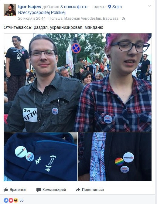 На своей странице в Facebook Исаев постоянно освещает события на польском Майдане. Он также сообщил о том, что занимается «украинизацией» Майдана, распространяя среди участников следующие значки.