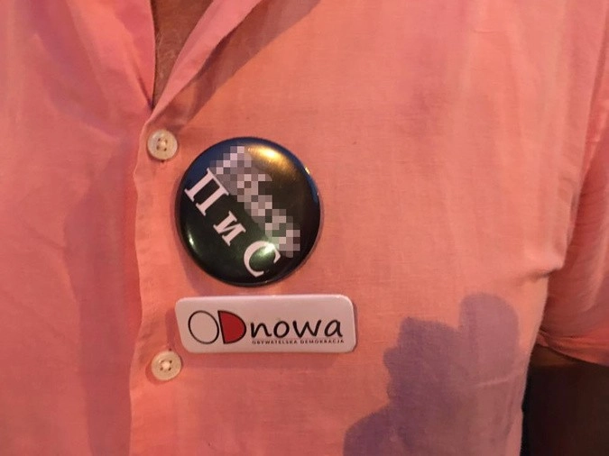 Украинский журналист раздает значки «ПиС ПНХ» на варшавском Майдане