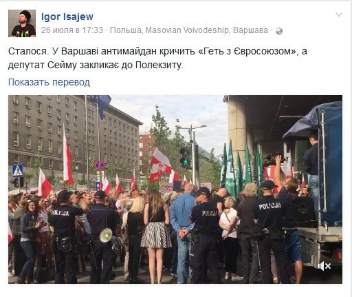Свершилось. В Варшаве антимайдан кричит „Долой Евросоюз“, а депутат Сейма призывает к Полекситу (по аналогии с Брекситом. — Прим. «Ридуса»), написал он в Facebook об акции польских националистов из Национально-радикального лагеря.