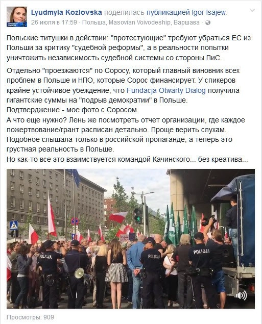 В материале сообщается, что проходящие в стране массовые протесты либеральной оппозиции против судебной реформы не являются спонтанными, хотя к ним действительно спонтанно присоединяются люди, подвергшиеся информационной обработке в духе «ПиС изменит устройство Польши на тоталитарное, суды станут партийными, а люди утратят свободу».