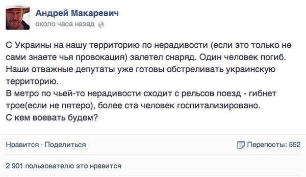 «В метро по чьей-то нерадивости сходит с рельсов поезд – гибнет трое (если не пятеро), более ста человек госпитализировано. С кем воевать будем? – написал, а затем быстро удалил пост в Фейсбуке Макаревич.
