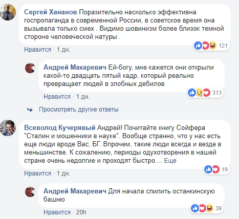 Начав обсуждать с подписчиками собственные слова, Макаревич заявил, что в России «открыли какой-то двадцать пятый кадр, который реально превращает людей в злобных дебилов». Чтобы исправить ситуацию, он предложил «спилить» Останкинскую телебашню.