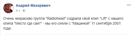 Лидер группы «Машина времени» Андрей Макаревич обвинил всемирно известную группу Radiohead в плагиате. Он указал на то, что музыканты сняли клип на свою песню «Lift», который как две капли воды похож на видео российских исполнителей.