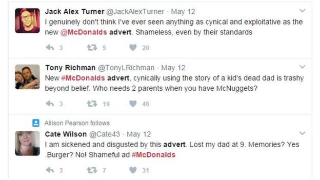 «Только что выплакал все глаза, глядя рекламу „Макдоналдс“. Просто идите на хрен за эксплуатацию идеи потерявшего отца ребёнка, поехавшие идиоты», — написал один из них.