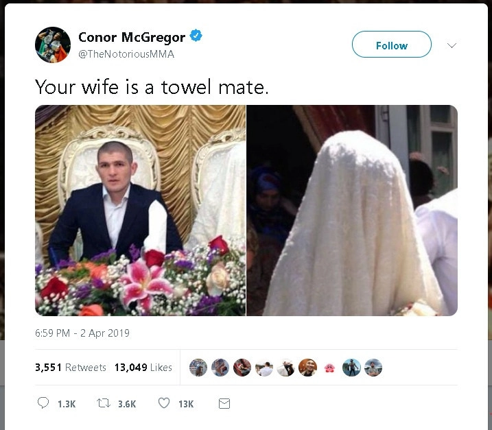 Твоя жена — полотенце, приятель, — написал ирландец в своем посте в Twitter и опубликовал фото Нурмагомедова с его свадьбы, на котором рядом с бойцом сидит его невеста в мусульманском головном уборе.