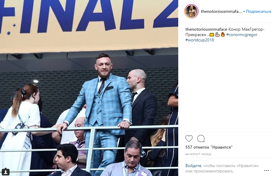 Ирландский боец смешанных боевых искусств Конор Макгрегор прилетел в Москву, чтобы посмотреть финальный матч чемпионата мира по футболу на стадионе «Лужники».