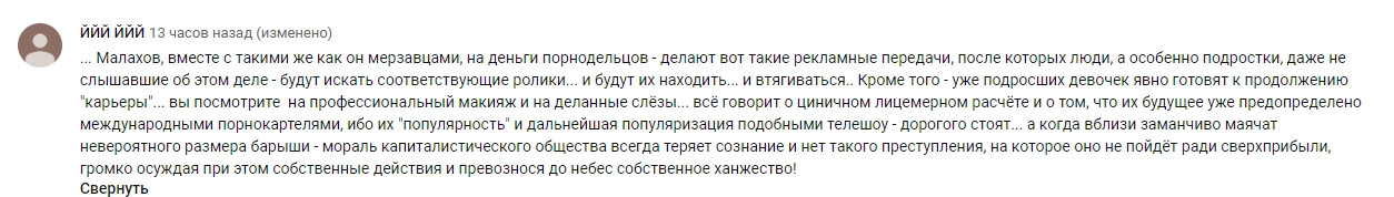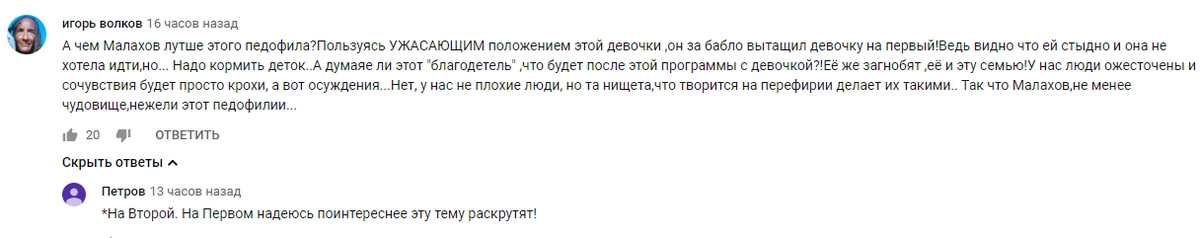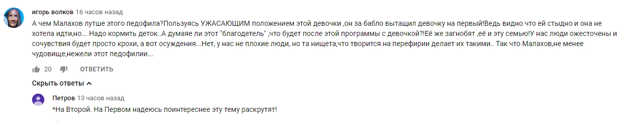 Российский телеведущий Андрей Малахов провел в эфире телеканала «Россия-1» передачу, посвященную фотографу, который продавал снимки несовершеннолетних девочек на порносайте «Сибирские мышки». Пользователи Сети раскритиковали ведущего за такую тему программы и обвинили в очередной попытке «похайпить» на непотребном скандале.