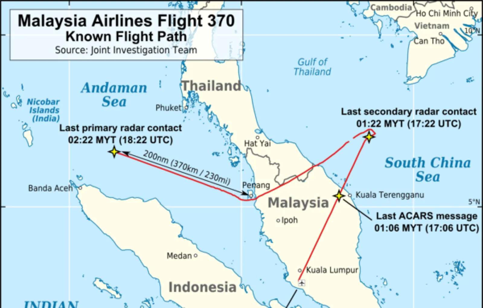 «Боинг-777» авиакомпании Malaysia Airlines, выполнявший рейс MH370 по маршруту Куала-Лумпур (Малайзия) — Пекин (Китай) 8 марта 2014 года, исчез над Южно-Китайским морем через 40 минут после взлета. На борту находились 239 человек: 227 пассажиров и 12 членов экипажа.