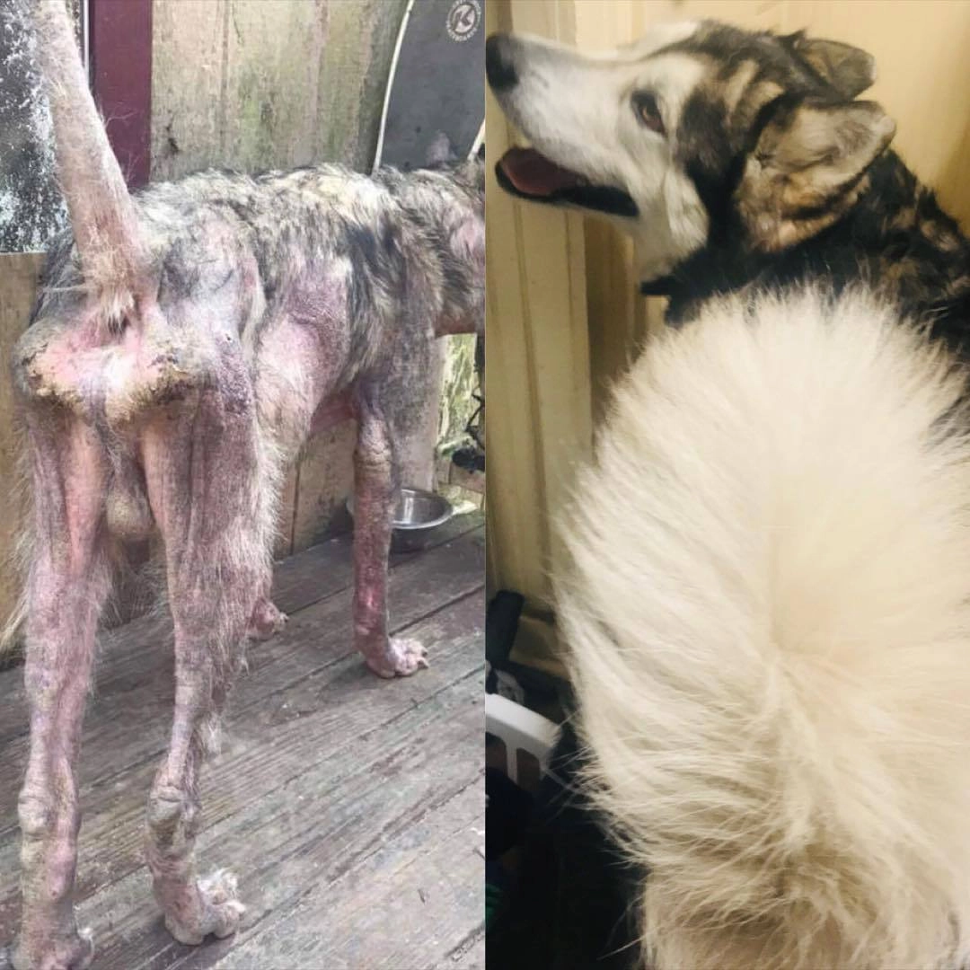 Медленно, но верно, забота девушки начала давать свои плоды — Один залечивал свои раны, потихоньку обрастал шерстью и начинал верить, что подвоха нет и его не посадят снова на цепь. Через пару месяцев из худого, больного, лысого и несчастного создания пёс стал превращаться в пушистого и довольного жизнью маламута. Глядя на фото, опубликованные Сидни в феврале 2019 года, сложно поверить, что пёс в роскошной густой шубе и тот худой лысый оборотень — одна и та же собака.