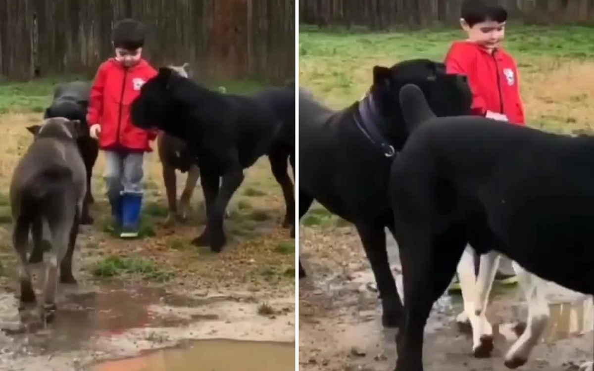 Некоторые породы собак у многих людей вызывают беспокойство одним только своим видом. Даже если пёсили ведут себя очень мирно и ласково, они все равно пугают. К таким «грозным» породам относятся и кане-корсо, очень крупные и мускулистые собаки, с которыми спокойно разгуливает маленький мальчик из этого видео. Псы явно настроены дружелюбно, хотя их внешность и производит обратное впечатление.