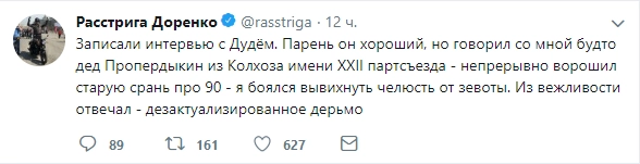Доренко добавил, что отвечал только из вежливости, и назвал интервью «дезактуализированным дерьмом».