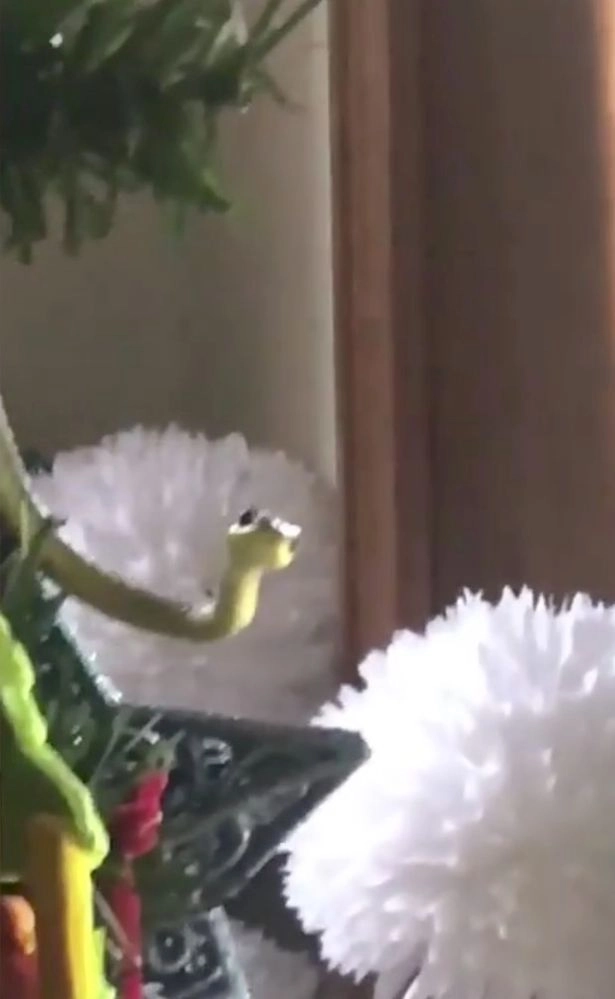 Затем она посмотрела на наряженную елку и обнаружила на ней новую игрушку, от которой хочется бежать куда подальше. На рождественском дереве была зеленая древесная змея, которая с любопытством посматривала на испуганных двуногих. К счастью, эта змейка не опасна для человека.