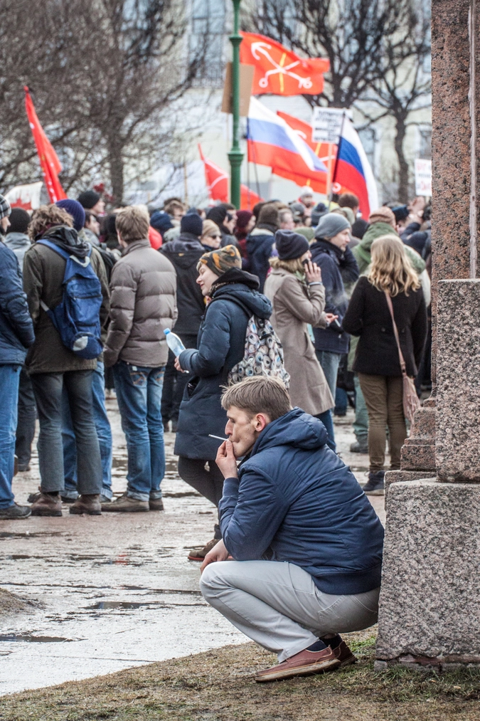 По прибытии на Марсово поле началась полная вакханалия. Пешеходный пяточок размерами ~13×70 метров, к которому была обращена сцена, оказался не в состоянии вместить пятитысячную толпу, в результате чего оппозиционеры начали размещаться на прилегающих газонах, которые в первый день весны ещё не обладали достаточно упругим травяным покровом, но уже успели потерять защитную подушку из снега. Ориентировочные подсчёты показывают, что митингующие разместились на 3000 квадратных метров газона, который в обычных парках в это время закрыт «на просушку».