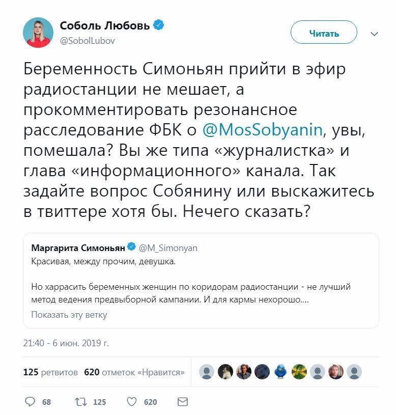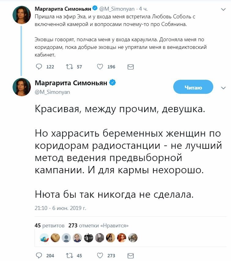О том, что произошло в здании «Эха Москвы», Симоньян рассказала в своем Твиттере. По ее словам, «харрасить беременных женщин по коридорам радиостанции — не лучший метод ведения предвыборной кампании».