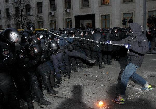 Однако отважные ребята из "Беркута", не имея даже щитов, перекрыли собой все имеющиеся подступы к сооружению. Крики, взрывы, звуки файеров и бьющихся об шлемы камней - все смешалось в один гул...