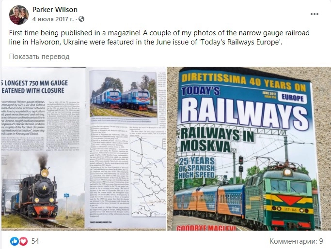 Заметку Паркера Уилсона об узкоколейке на Украине опубликовал журнал «Современные железные дороги Европы».