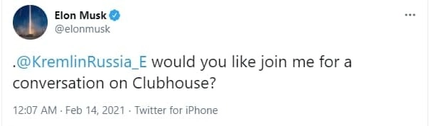 Американский миллиардер, основатель компаний SpaceX и Tesla Илон Маск пригласил президента России Владимира Путина к участию в беседе в новой модной социальной сети Clubhouse.