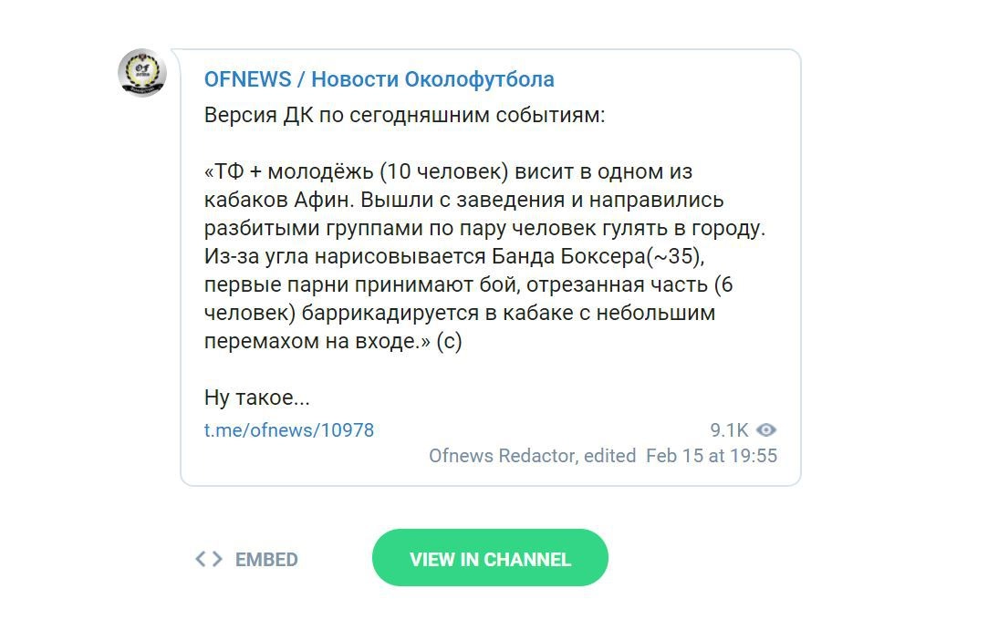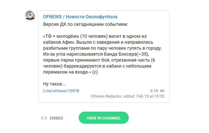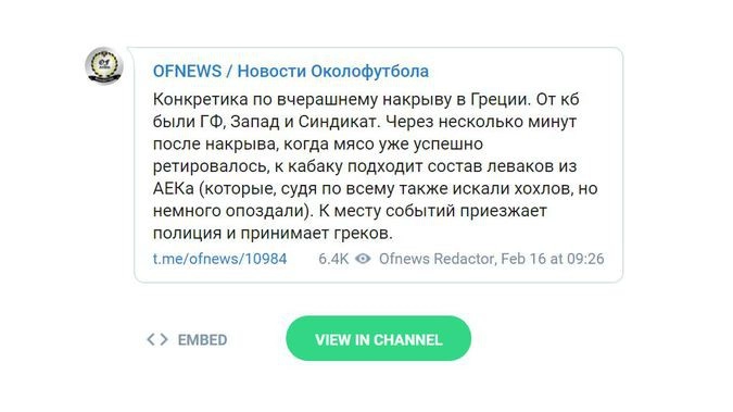 Фанаты «Спартака» побили в Афинах «фирму» украинских хулиганов Terror Family по случаю проведения матча между греческим футбольным клубом АЕК и командой «Динамо Киев». Сообщениями об этом пестрят все футбольные паблики, группы и каналы в социальных сетях, но, несмотря на это, российские СМИ умудрились подать события с точностью до наоборот.