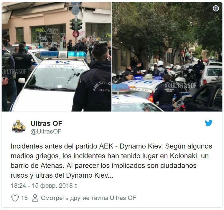 «Хулиганы напали на группу из пяти россиян, проживающих в Афинах, когда те выходили из кафе в центре города. „По одним данным, их было от 15 до 20 человек, по другим — до 40 человек“, — пишет интернет-издание iefimerida.gr. Украинские болельщики разгромили кафе, разбили витрины. „Прибывшие на место полицейские из группы быстрого реагирования арестовали 18 человек, у них изъяты ножи и кастеты“, — сообщает издание», — такую версию событий опубликовало РИА Новости.