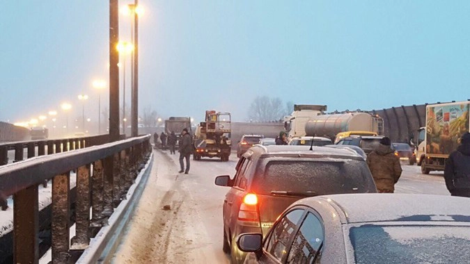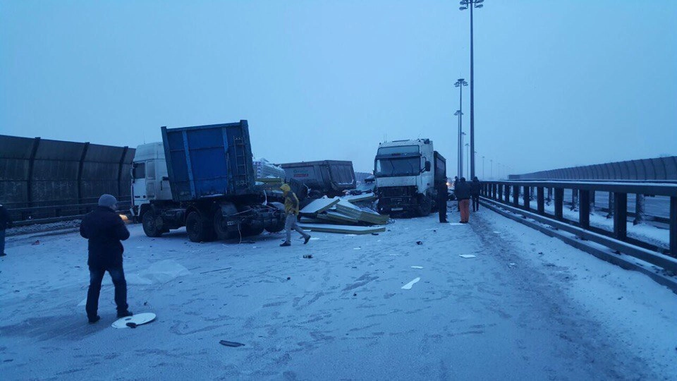 Как сообщает РЕН ТВ, изначально столкнулись два грузовика, позже в них въехали несколько легковых машин. Следом произошли еще два ДТП в шестью автомобилями.