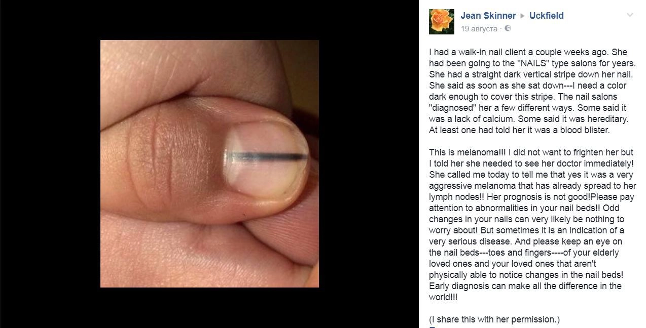 «Несколько недель назад у меня была клиентка, которая попросила покрасить ей ногти в темный цвет, чтобы скрыть на ногте вертикальную серую полоску. Я сразу же поняла, в чем дело, но не стала пугать клиентку и просто посоветовала ей обратиться к доктору. Через некоторое время она перезвонила мне и сообщила, что у нее диагностировали меланому. Причем агрессивную форму с метастазами в лимфатических узлах», — рассказала Скиннер в Facebook.