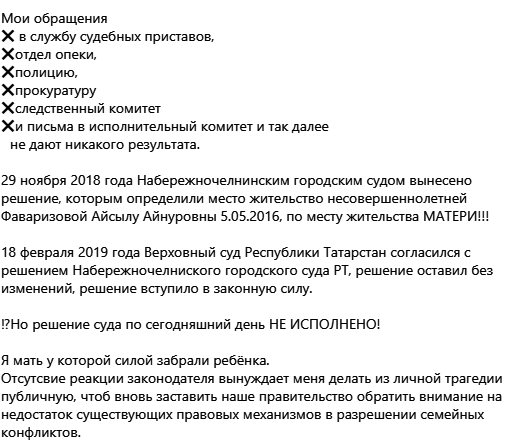 «Отец ребенка уклоняется от исполнения решения суда. С 1 апреля 2019 года ребенок в розыске. Но ее никто не ищет. Отец ребенка спокойно живет и нарушает законы, показывая пример другим гражданам», — сообщила женщина.