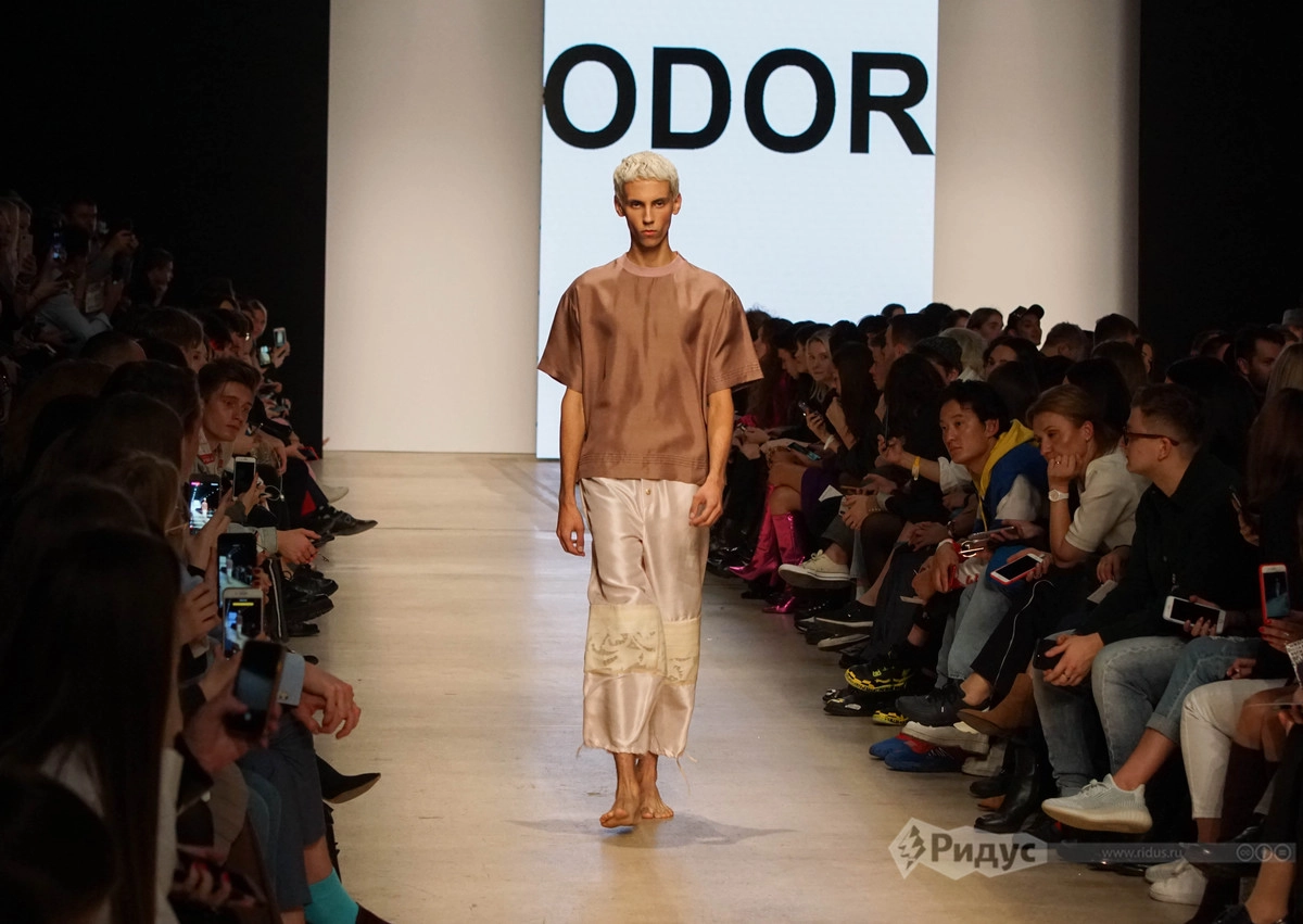 Весенняя коллекция ODOR — это рассказ о любви и трагедии. Босоногие и по-детски румяные модели так похожи на детей, которые только вернулись с прогулки. Но по черной парче и плащам из тяжелой ткани мы понимаем, что беззаботное время для них уже подошло к концу. Нежная французская музыка и кадры из документального фильма про мальчика, которого война застала в расцвете юности, помогают создавать нужную атмосферу.
